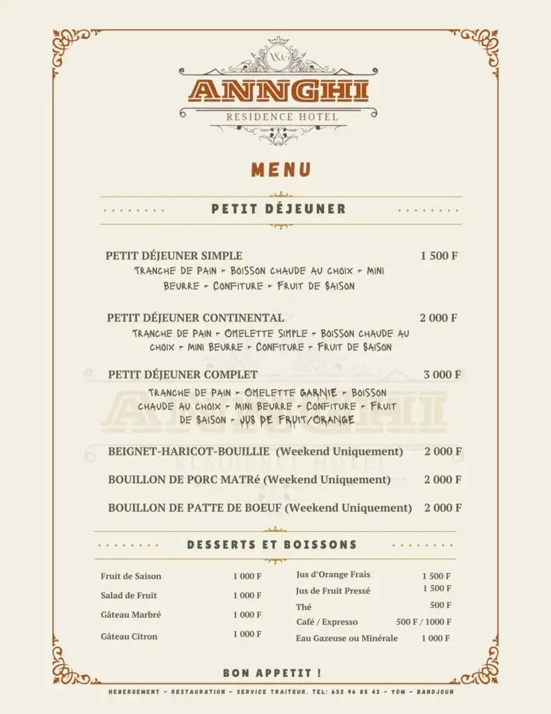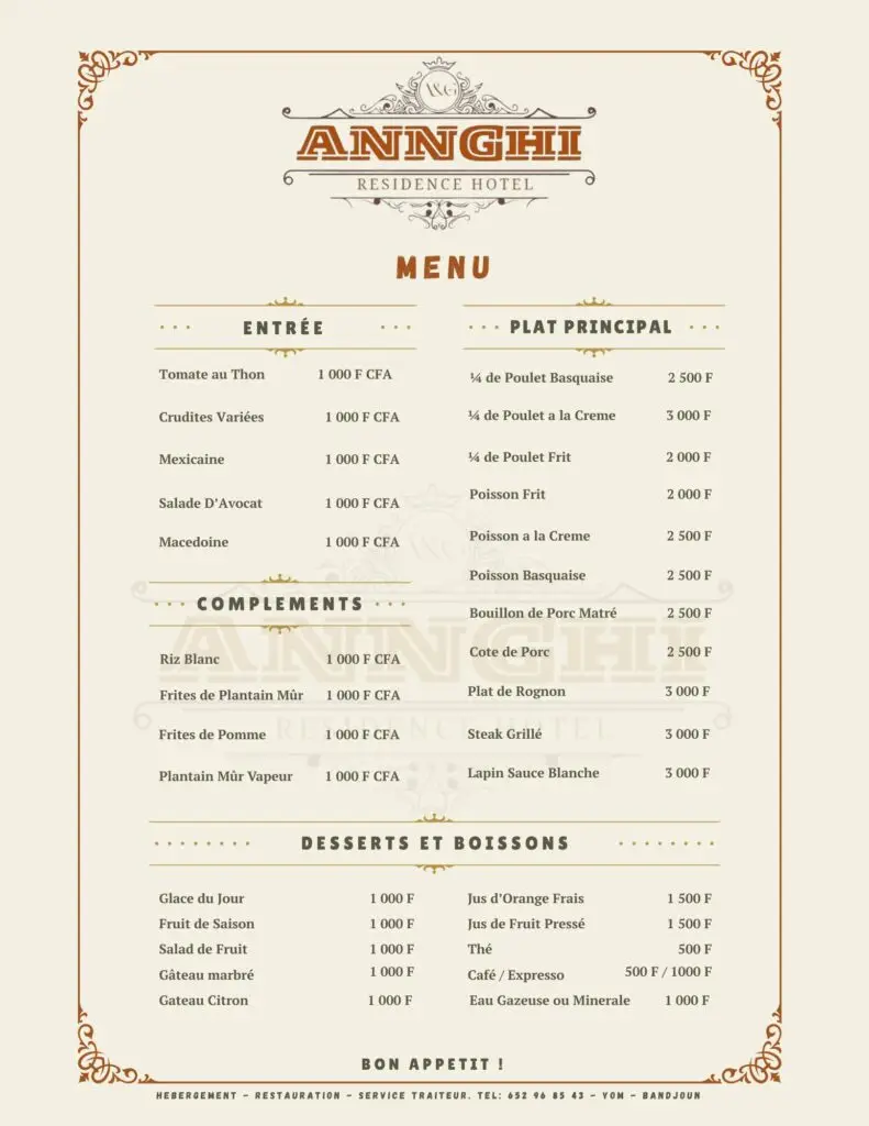 En définitive, le restaurant d’ANNGHI Residence Hotel s’impose comme une table de confiance à Bandjoun. Sans chercher à rivaliser avec les restaurants gastronomiques, il assume pleinement son rôle : offrir une restauration régulière, accessible et cohérente, parfaitement alignée avec les attentes d’une clientèle en quête de stabilité et de tranquillité.